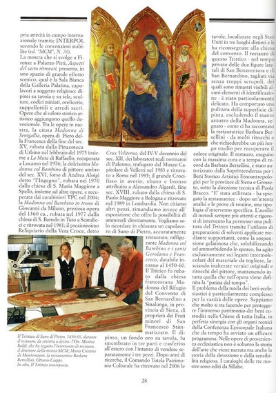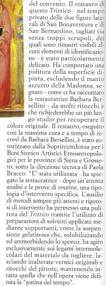La mostra rappresenta l’occasione anche per presentare due importanti restauri: da una parte il polittico di Sano di Pietro della chiesetta del Convento di San Bernardino a Sinalunga che in ordine cronologico è fra i recuperi più recenti del Comando NTPC, dall’altro il trittico di Mariotto di Nardo della chiesa di Sant’Angelo a Legnaia che verrà poi ricollocato nella sua sede di provenienza.