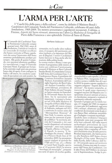 Questa mostra nella sede fiorentina e le due consorelle a Roma e Napoli sono “la festa di compleanno” del Comando Tutela Patrimonio Artistico, ma ancor più occasioni propizie per un bilancio di quanto e come si è fatto e di quanto si potrà e si dovrà ancora fare.